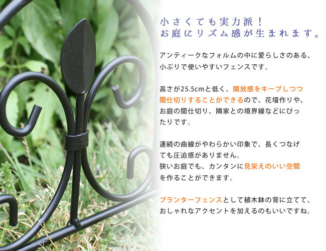 アイアンミニフェンス(リーフ) 3枚組 IPN-7238TG-3P ■商品名アイアンミニフェンス(リーフ) 3枚組 ■型番 IPN-7238TG-3P ■カラー ブラック ■サイズ 本体:幅 約470×高さ 約255mm(線径 約6mm)(1枚) ■重量 約0.4Kg(1枚) ■材質 スチール ■仕上げ 粉体塗装 ■組立区分 完成品 ■生産国 中国 ■備考 基本的に埋め込み部分をしっかり埋め込んで頂ければ自立しますが、柔らかすぎる地面などでは倒れる恐れがありますので、お客様自身で固定いただくか、ご使用をお避けください。