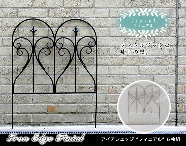 アイアンフェンス フィニアル 6枚組 IPN-7293-6P ■商品名アイアンフェンス フィニアル 6枚組 ■カラー/型番 ブラック…IPN-7293-6P ホワイト…IPN-7293-6P-WHT ■サイズ 本体:幅 約615×奥行 約12×高さ 約790mm ※地中埋め込み部分 約200mm ■重量 約1.4Kg ■材質 アイアン(粉体塗装) ■組立区分 完成品 ■生産国 中国 ■備考 基本的に埋め込み部分をしっかり埋め込んで頂ければ自立しますが、柔らかすぎる地面などでは倒れる恐れがありますので、お客様自身で固定いただくか、ご使用をお避けください。