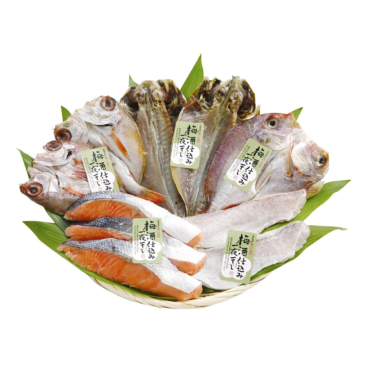 地元酒蔵の梅酒で漬け干しした干物5種(小鯛・あじ・のどぐろ・甘鯛・銀鮭)計10切セットです。