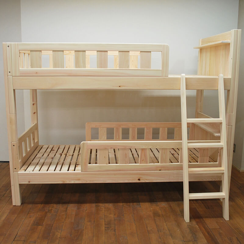 [サイズ変更可能]子供から大人まで安心して使える無垢ひのき二段ベッドヘッド角棚板付き無塗装仕上げ5R