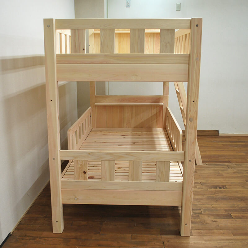 商品の特徴 頑丈ひのき別柱補強で上下補強していますので地震の揺れにも安心設計、子供から大人まで使えるひのき二段ベッド 素材にこだわりたい方に国産無垢ひのき材使用、自社での受注生産、有害物質の発生するものは使っていないので、誰もが安心して使っていただけます。