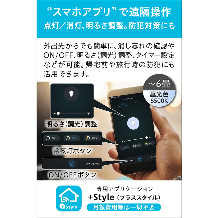 スマホアプリで、外出先からの遠隔操作も可能 スマホの+Styleアプリを通じて、照明のON/OFFやタイマー設定、調光の切替、シーン切替などかんたんに細かな設定ができます。