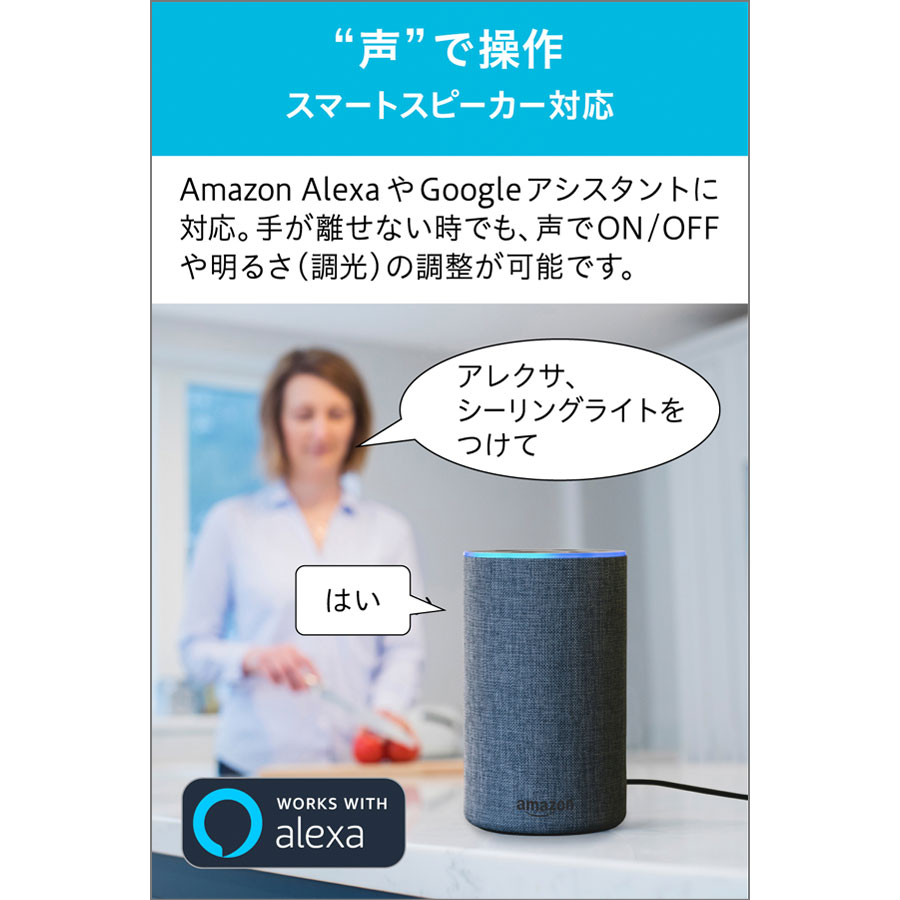 音声操作にも対応 GoogleアシスタントやAmazon Alexa(アレクサ)といったスマートスピーカー(AIスピーカー)による音声操作にも対応。