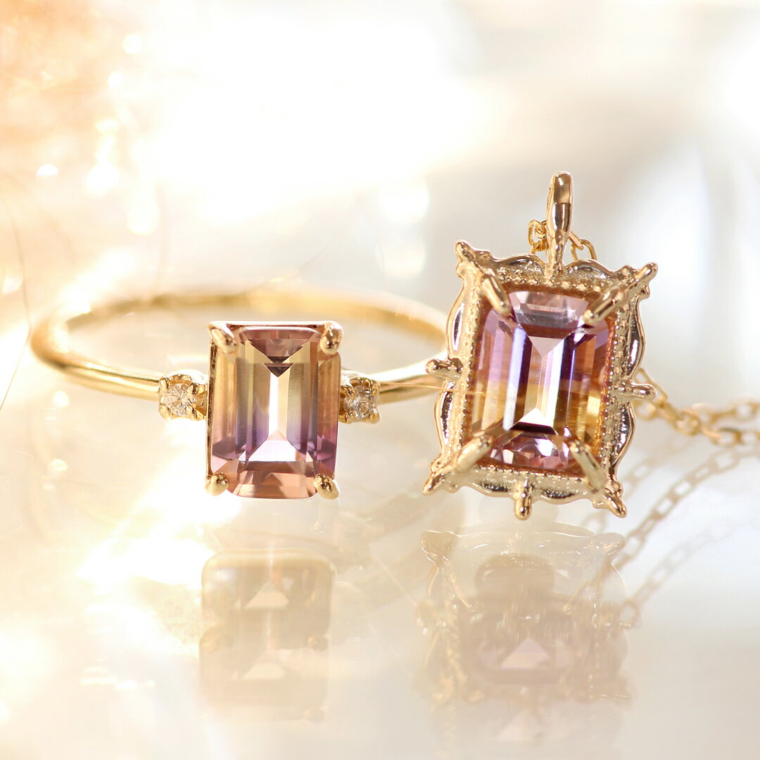 >>K18はこちら<< 「1つの宝石に混ざりあう、2つの色」 スミレのような紫に、黄金色が混ざりあう宝石「アメトリン」。